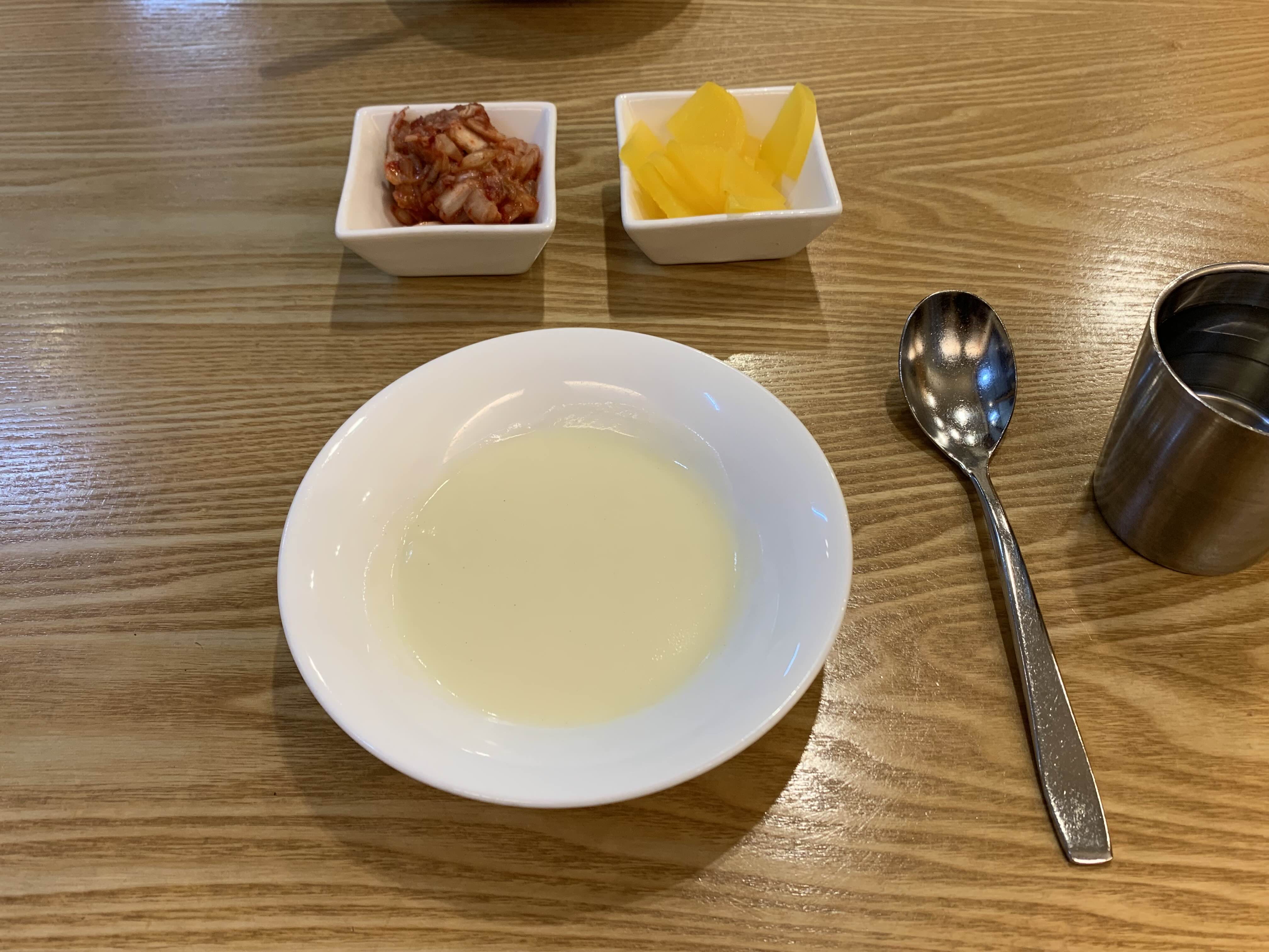 돈가스에 미치다에 나오는 기본 반찬은 김치와 단무지, 크림 스프예요.