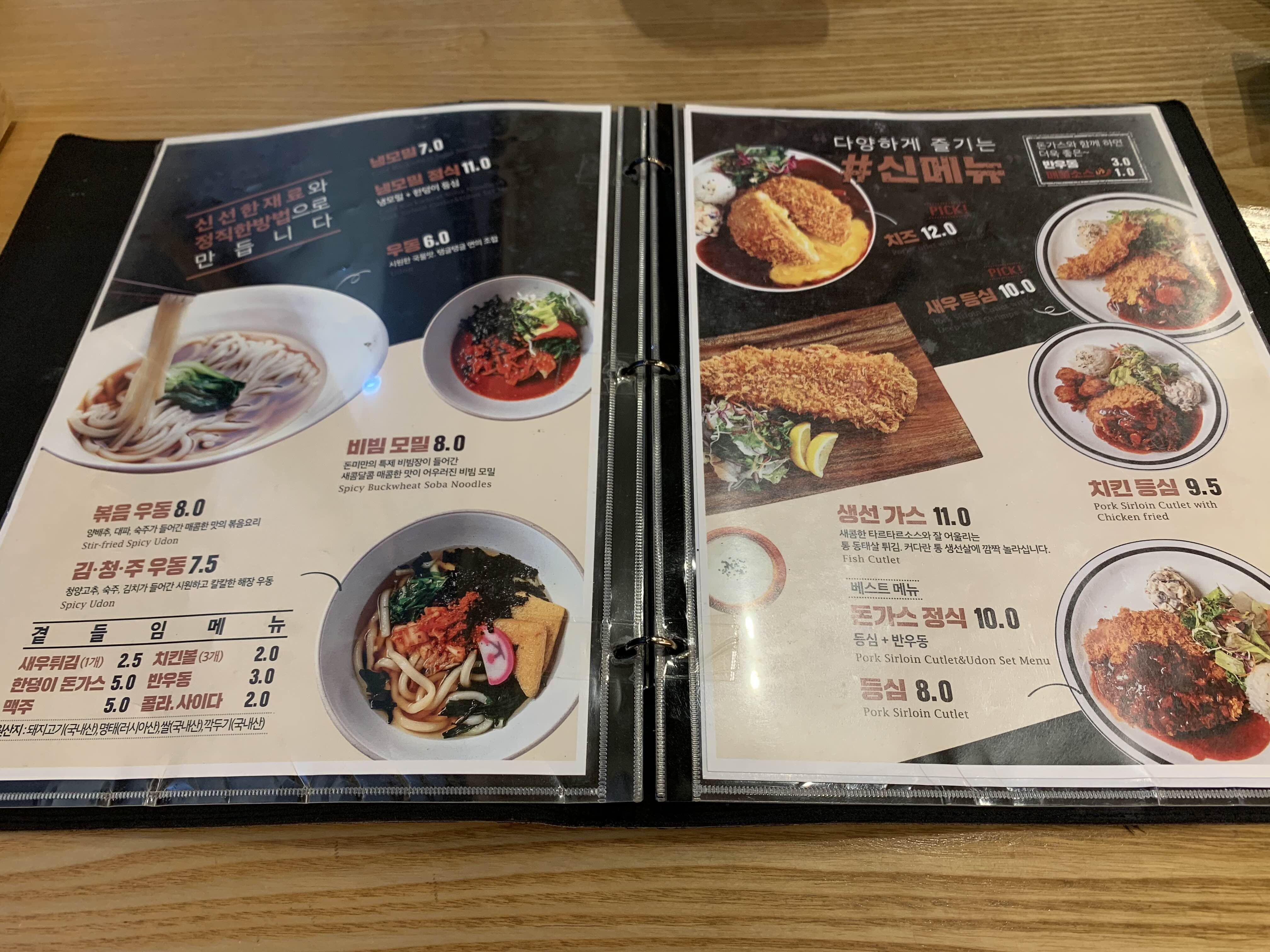 돈까스는 생선, 새우, 치킨, 등심, 치즈가 준비되어있고 곁들여 먹을 수 있는 면요리는 우동과 모밀이 판매 중이에요.