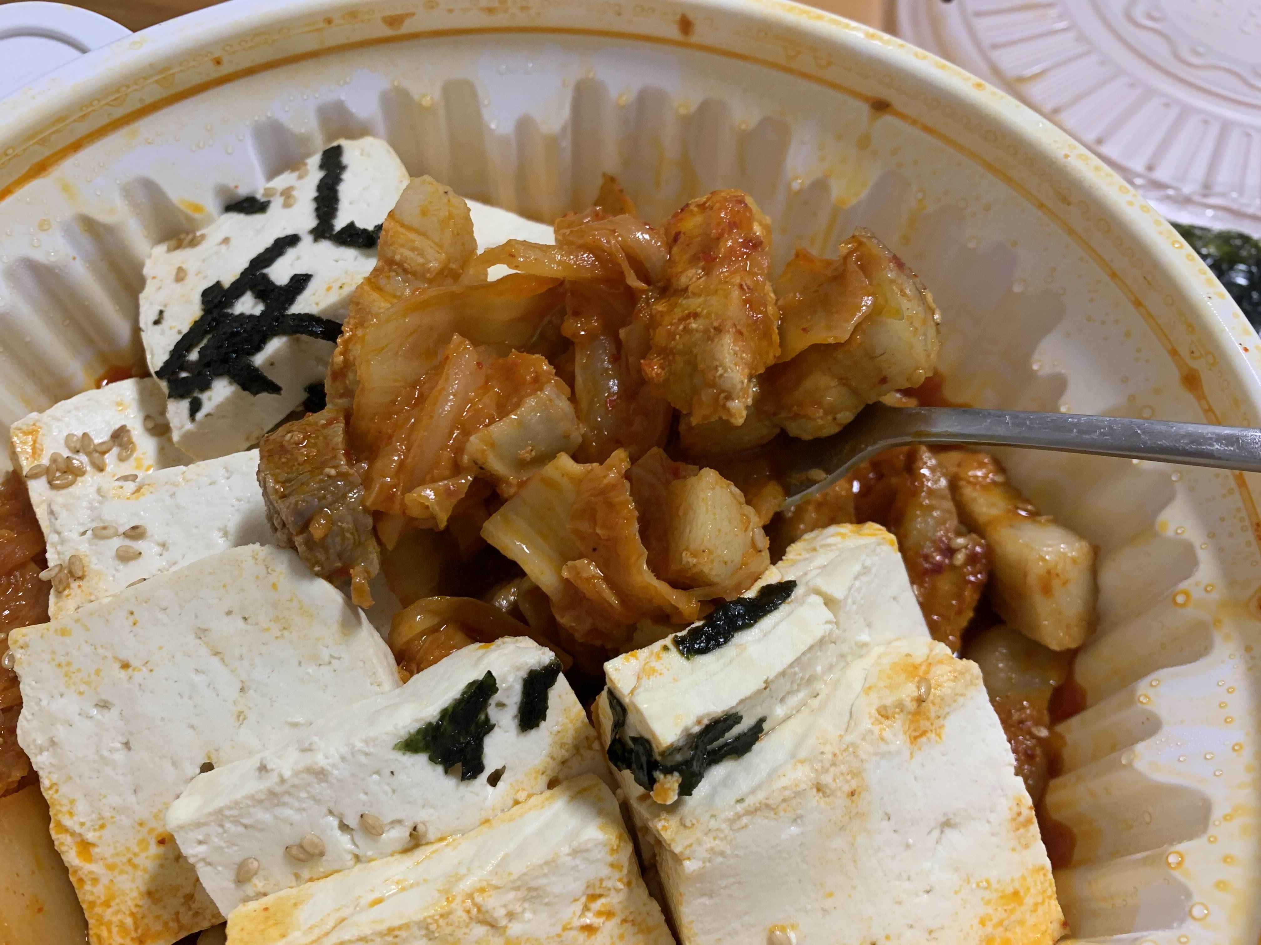 일단 비주얼은 완전 합격이었던 삼겹 왕창 김치찜. 두부 토핑도 추가 가능해서 바로 추가했어요.