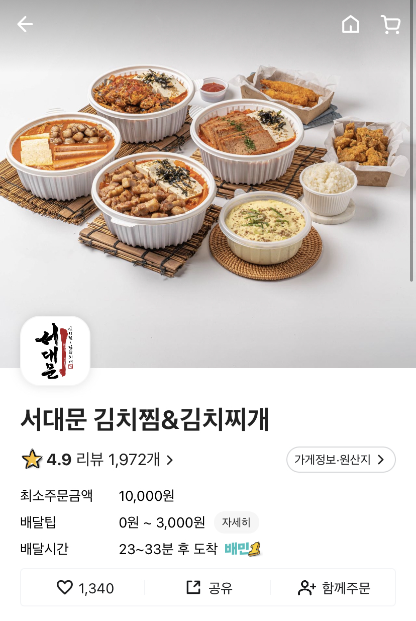 주문 많은 순으로 보니까 서대문 김치찜&김치찌개가 1위길래 한 번 주문해 보았습니다.