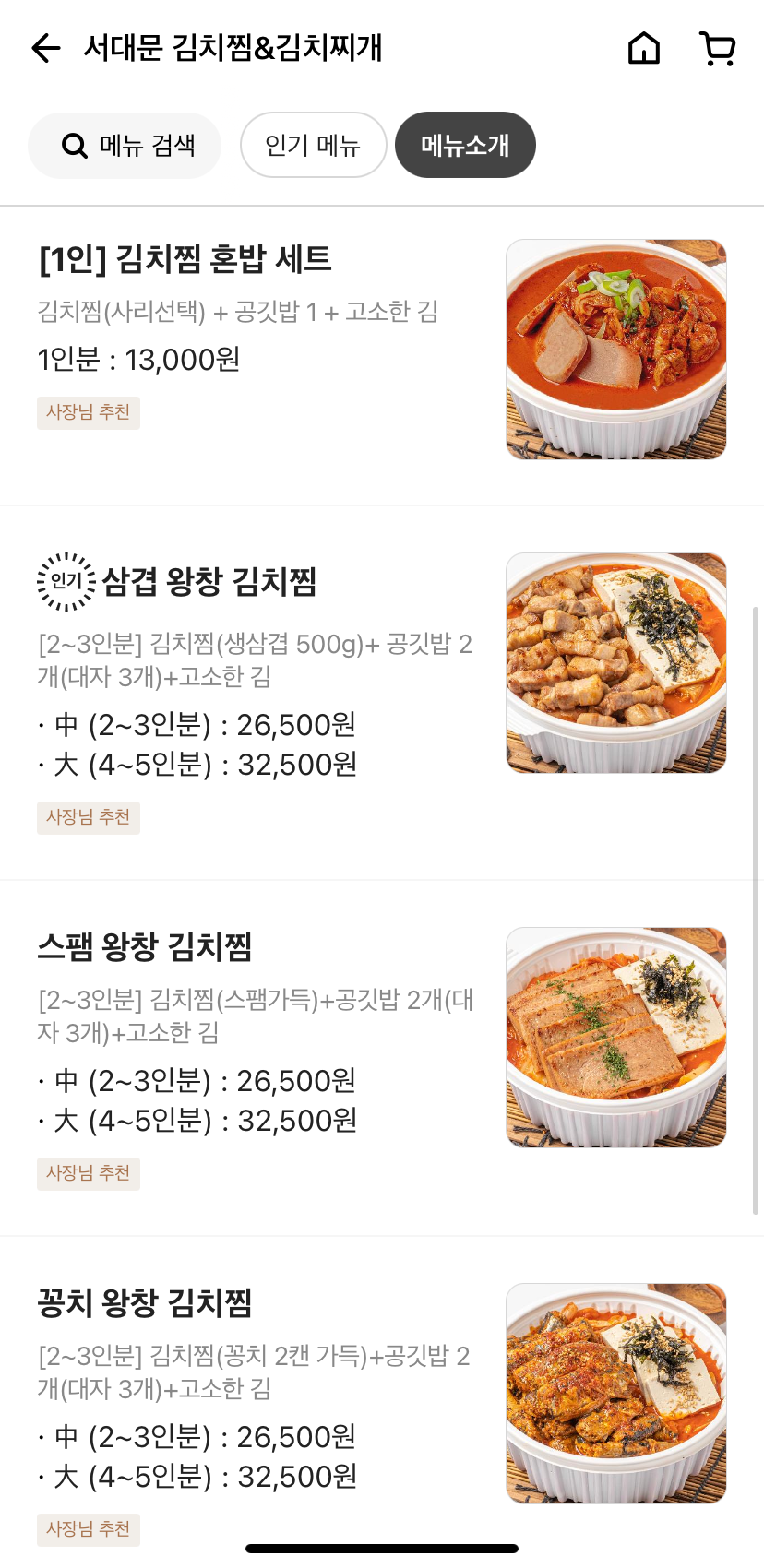 서대문 김치찜은 왕창!이라는 주제로 메뉴를 개발했더라고요. 삼겹 왕창, 꽁치 왕창, 스팸 왕창 등 재료를 아끼지 않고 듬뿍 넣는 것이 특징인 것 같아요.
